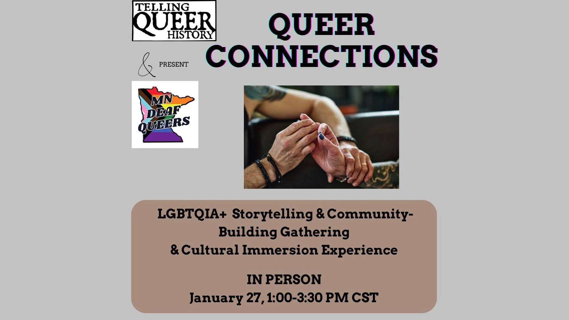 Minnesota Deaf Queers (MDQ) is partnering with Telling Queer History (TQH) to produce and present Queer Connections, a storytelling and community-building gathering that centers the lives and experiences of LGBTQIA+ Deaf, DeafBlind, and Hard of Hearing folks.